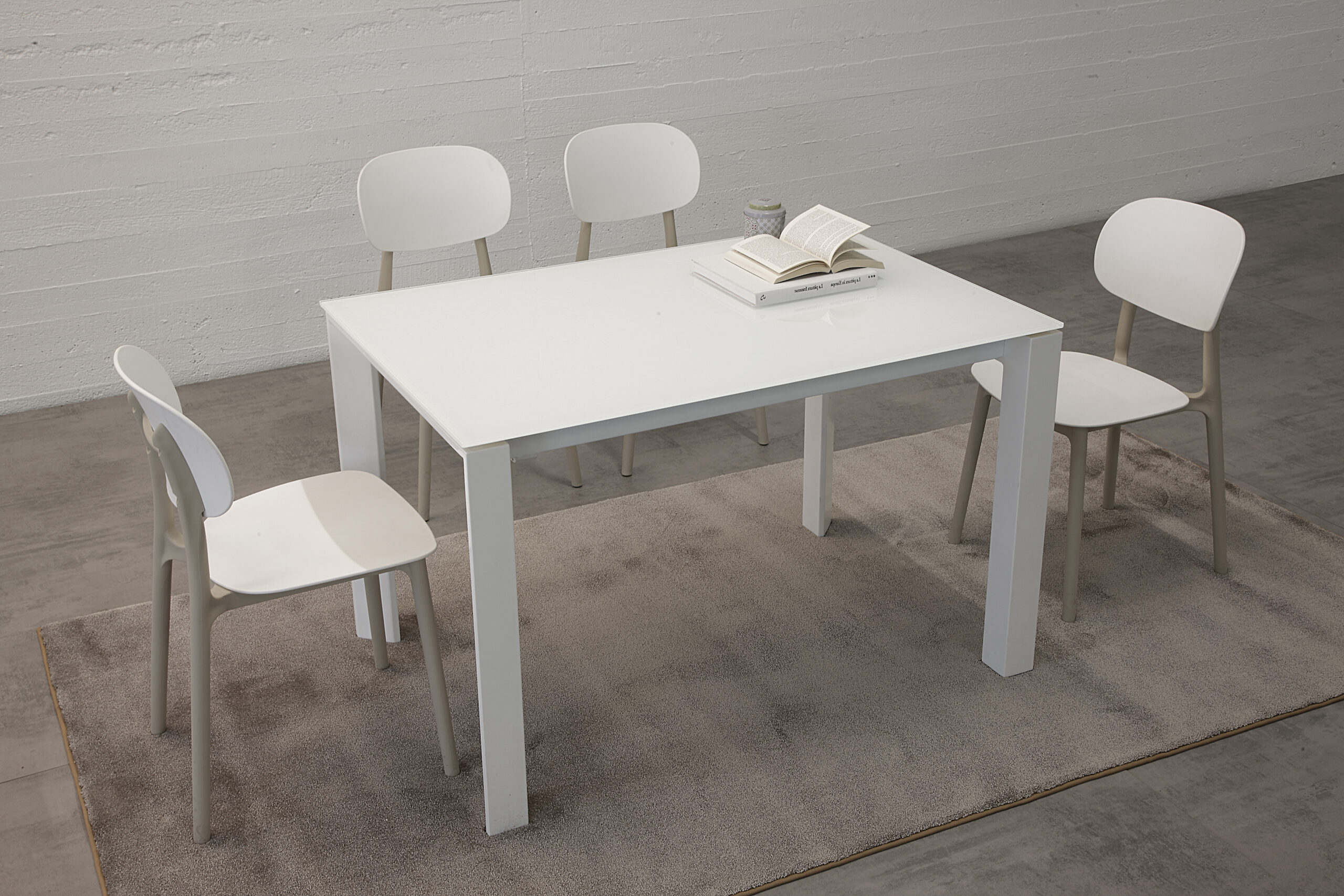 È dotato di una singola allunga a libro in laccato lucido in tinta, che si integra perfettamente con l’estetica del tavolo.